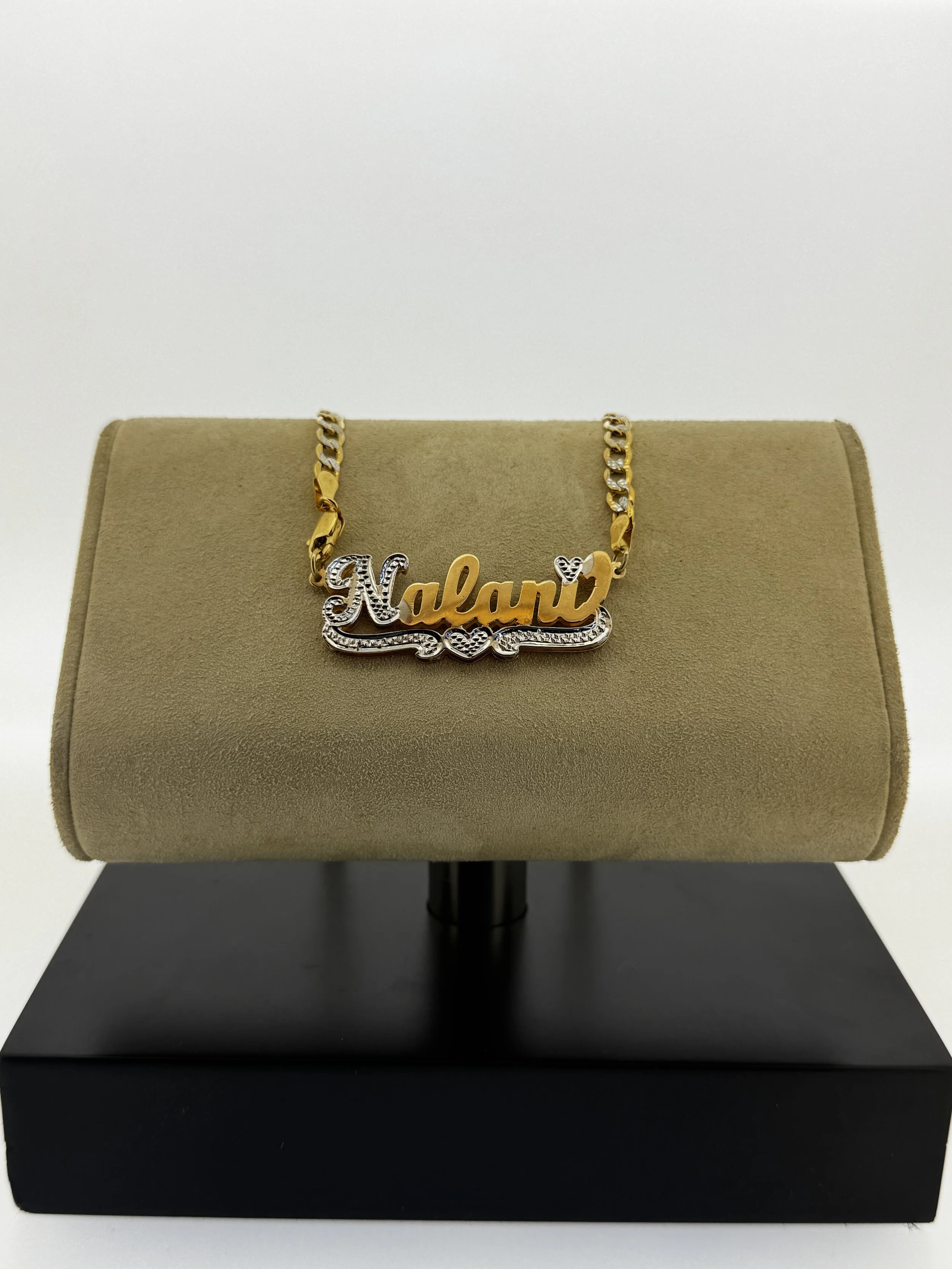 Make a statement with our Custom Gold Double Plate, designed to showcase your unique name or message in stunning 10k or 14k gold. Necklace not included, allowing you to match with your favorite chain.